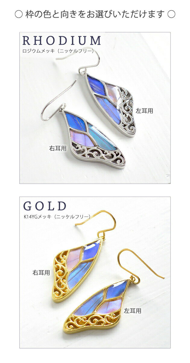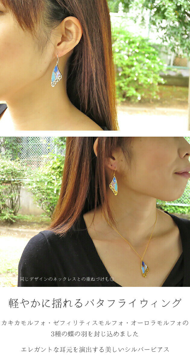 Item Info 【素材】 シルバー925(ロジウムメッキ/ゴールドメッキ)/樹脂 【蝶の種類】 カキカモルフォ/ゼフィリティスモルフォ/オーロラモルフォ(生息地:ペルー) 【大きさ】 縦:3.2×横:1.4×厚さ:0.3cm(フック部分除く) 【重さ】 約5g(片耳1個ぶん) ★